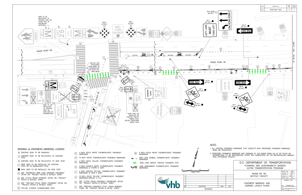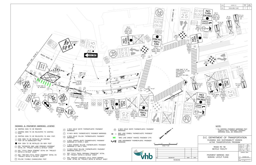 The District Department of Transportation (DDOT) reissued a Notice of Intent for a two-way cycletrack on the south side of Riggs Road from 1st Place NE to South Dakota Avenue NE. DDOT will use part of the dedicated right-turn lane for the cycletrack. A shorter right-turn lane will remain. DDOT completed installation of the cycletrack in March 2025.