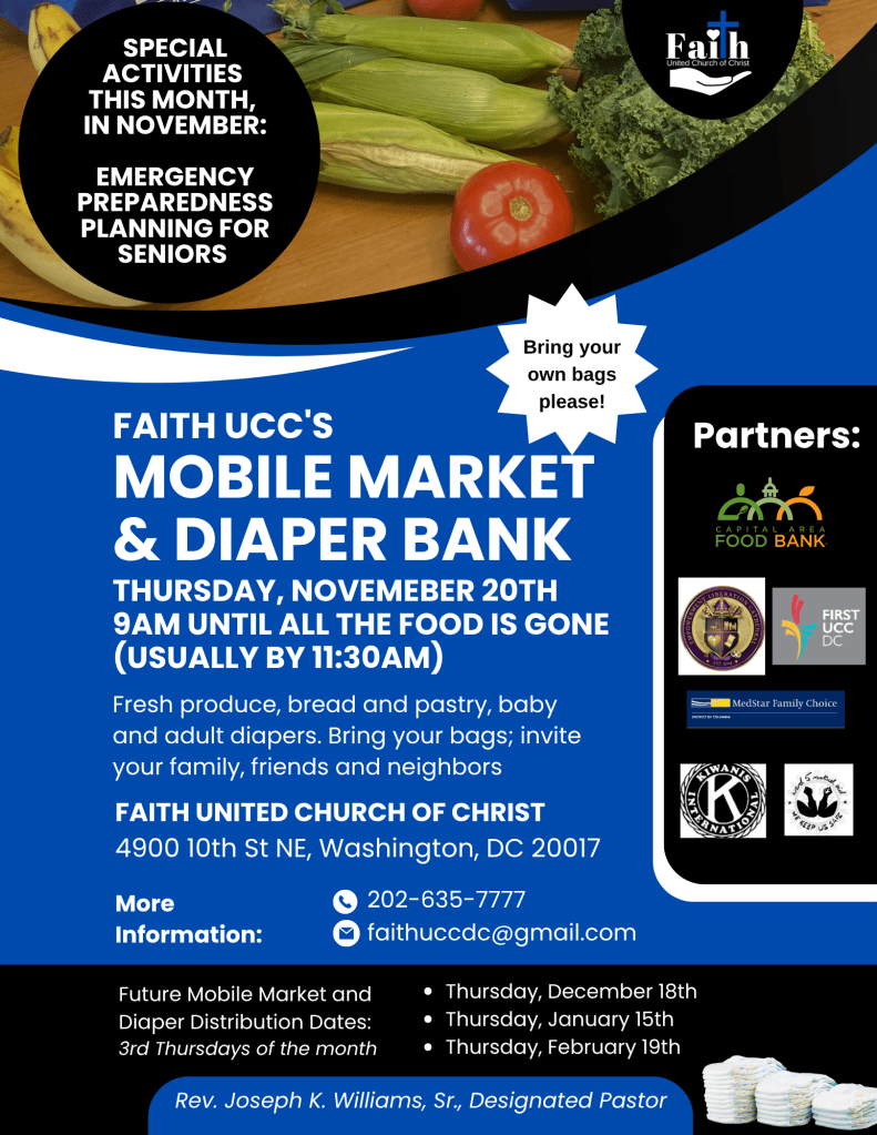 On November 20, 2025, Faith United Church will distribute turkeys to the first 200 people at their monthly mobile market/diaper bank. Beginning at 9:00 am. Located at 4900 10th Street NE.